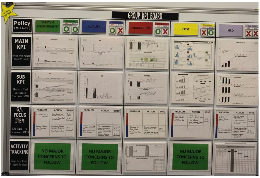 - Decide on clear KPIs (e.g. customer satisfaction, profits). Have KPIs for different areas (e.g. quality, cost, production, safety) and causal sub-KPIs (that you can take action towards). Occasionally track more specific problem metrics affecting main KPIs.